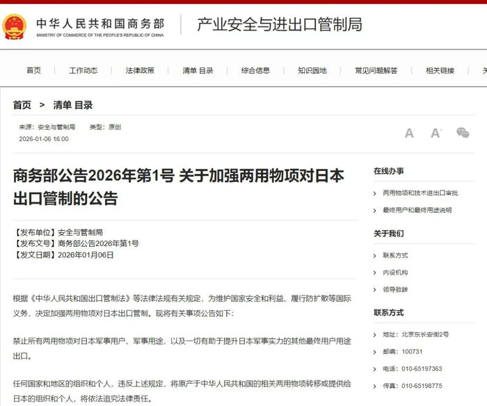 1月6日,商务部发布2026年第一号公告,明确加强对日本两用物项出口管制求股票配资,核心内容可概括为三个“禁止”:禁止所有两用物项对日本军事用户出口;禁止对日本军事用途出口;禁止对一切有助于提升日本军事实力的其他最终用户及用途出口。